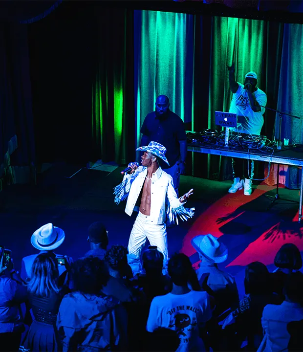 Framed as a "silent rodeo," all audio for the event was transmitted into Beats By Dre headphones to generate a unique and brand centric experience. Following the marionette show, Lil Nas X surprised the audience with a lively yet intimate performance featuring “Old Town Road,” “Panini” and “C7losure (You Like).” The show even featured a guest appearance from a Miss Catty B for “Rodeo.”