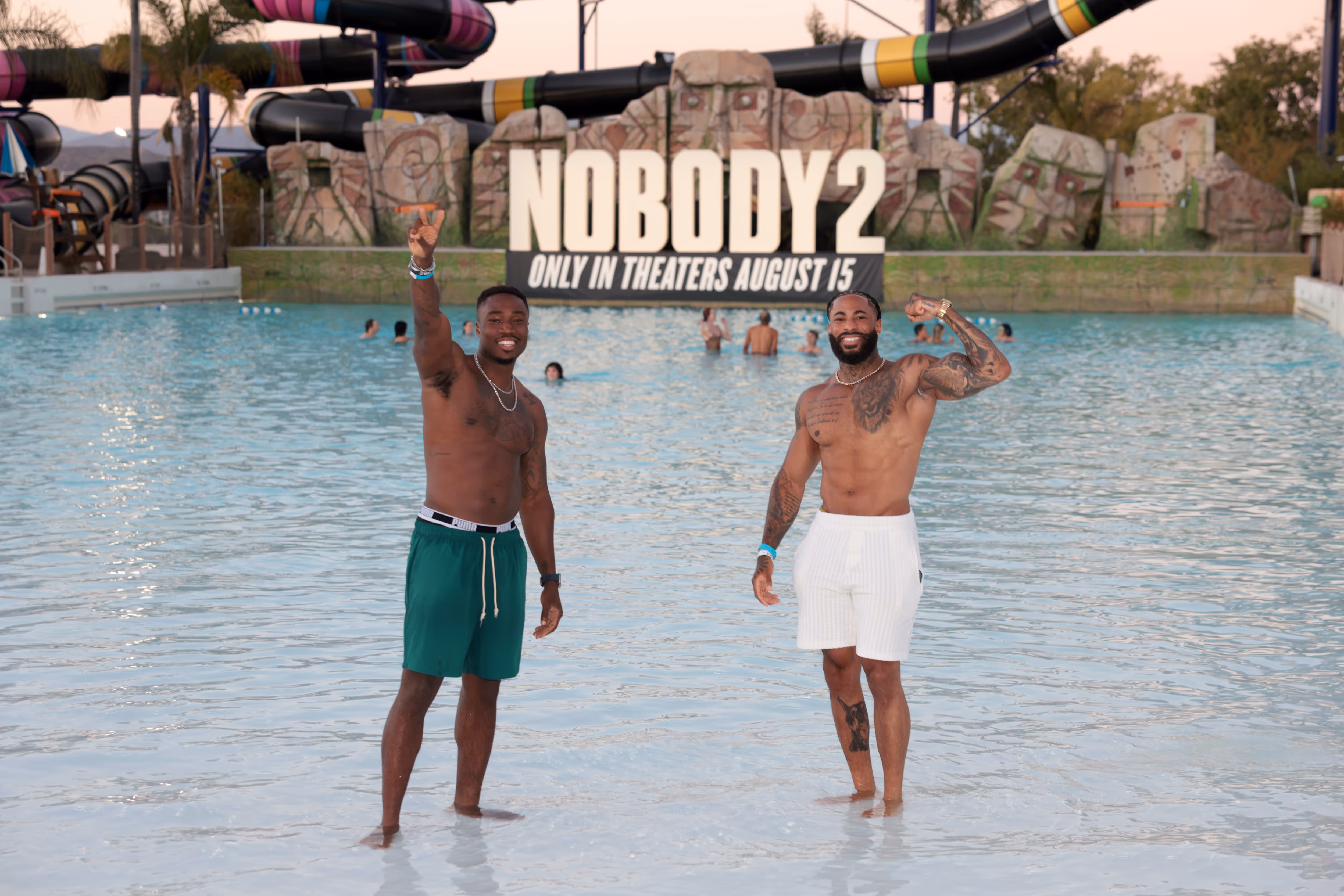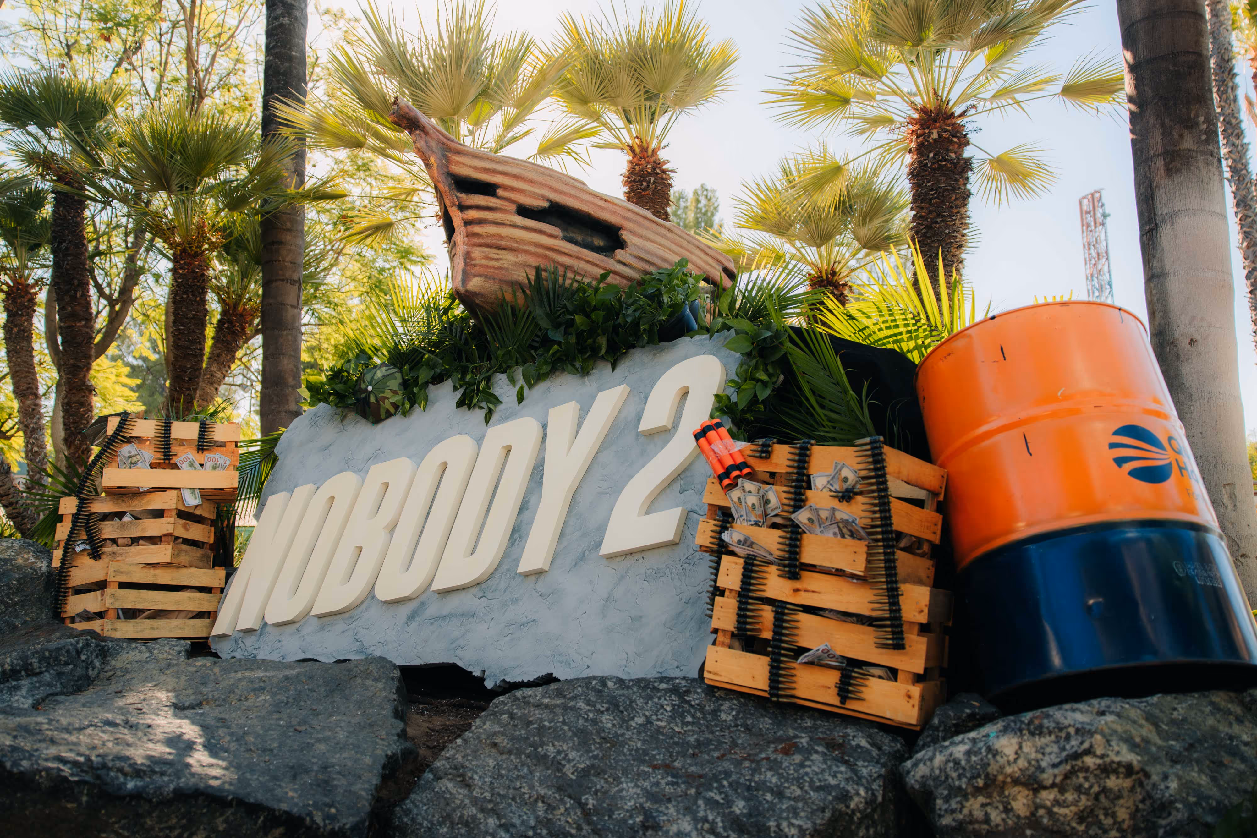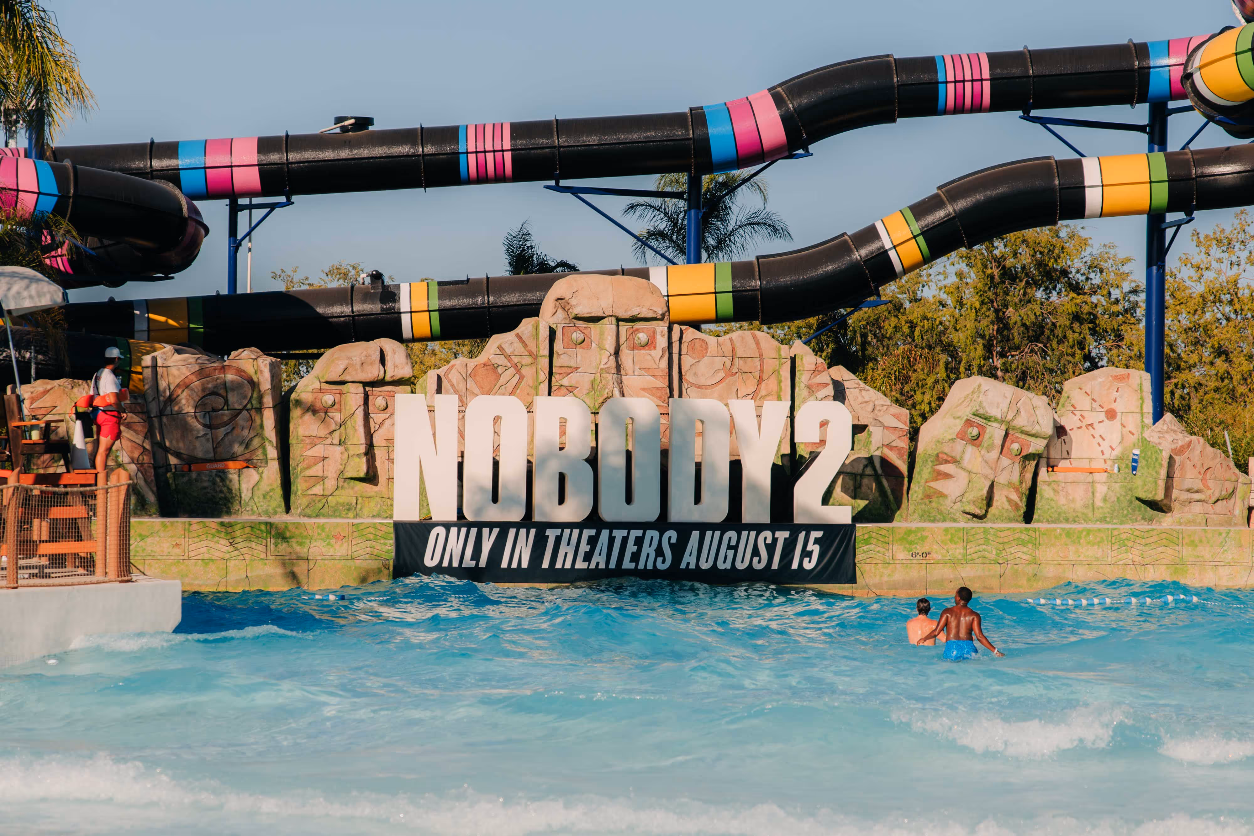 Throughout the park, guests were invited to capture memorable moments at multiple themed photo opportunities. VIP guests posed for photos with our onsite Getty photographer in front of a bold display featuring the film’s title treatment and action-themed props like crates of fake money, bullets, and explosives. A massive Nobody 2 title, anchored by an in-theaters banner, rose from the wave pool, creating a larger-than-life hero photo moment.