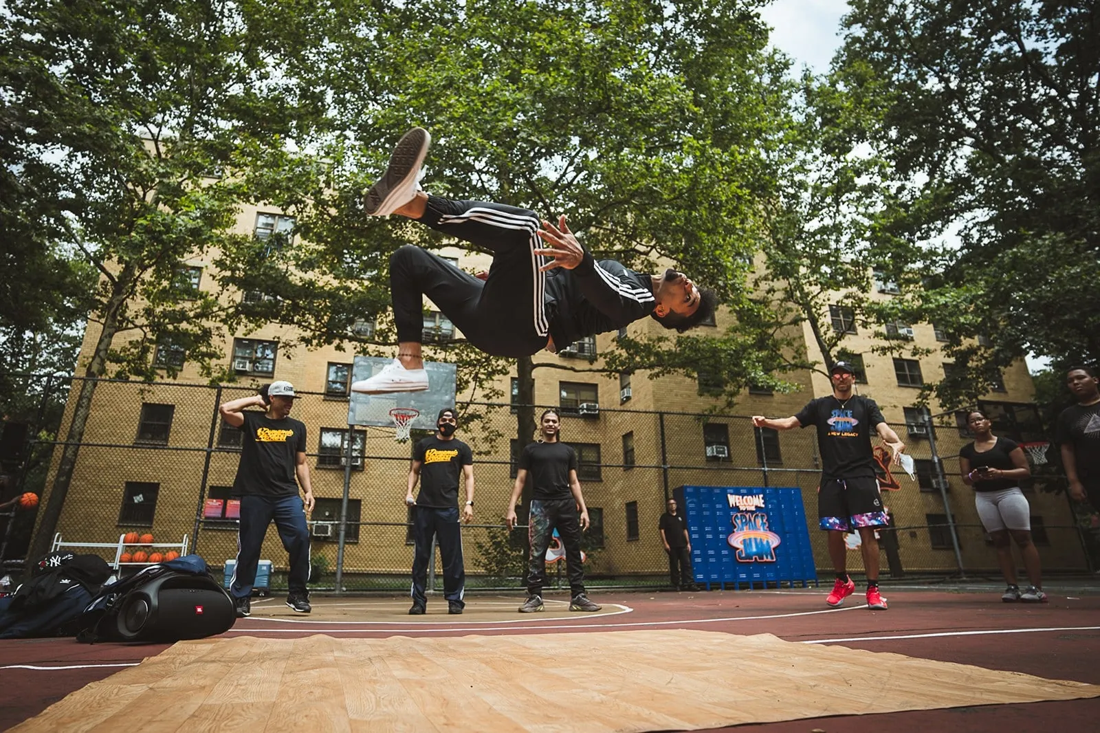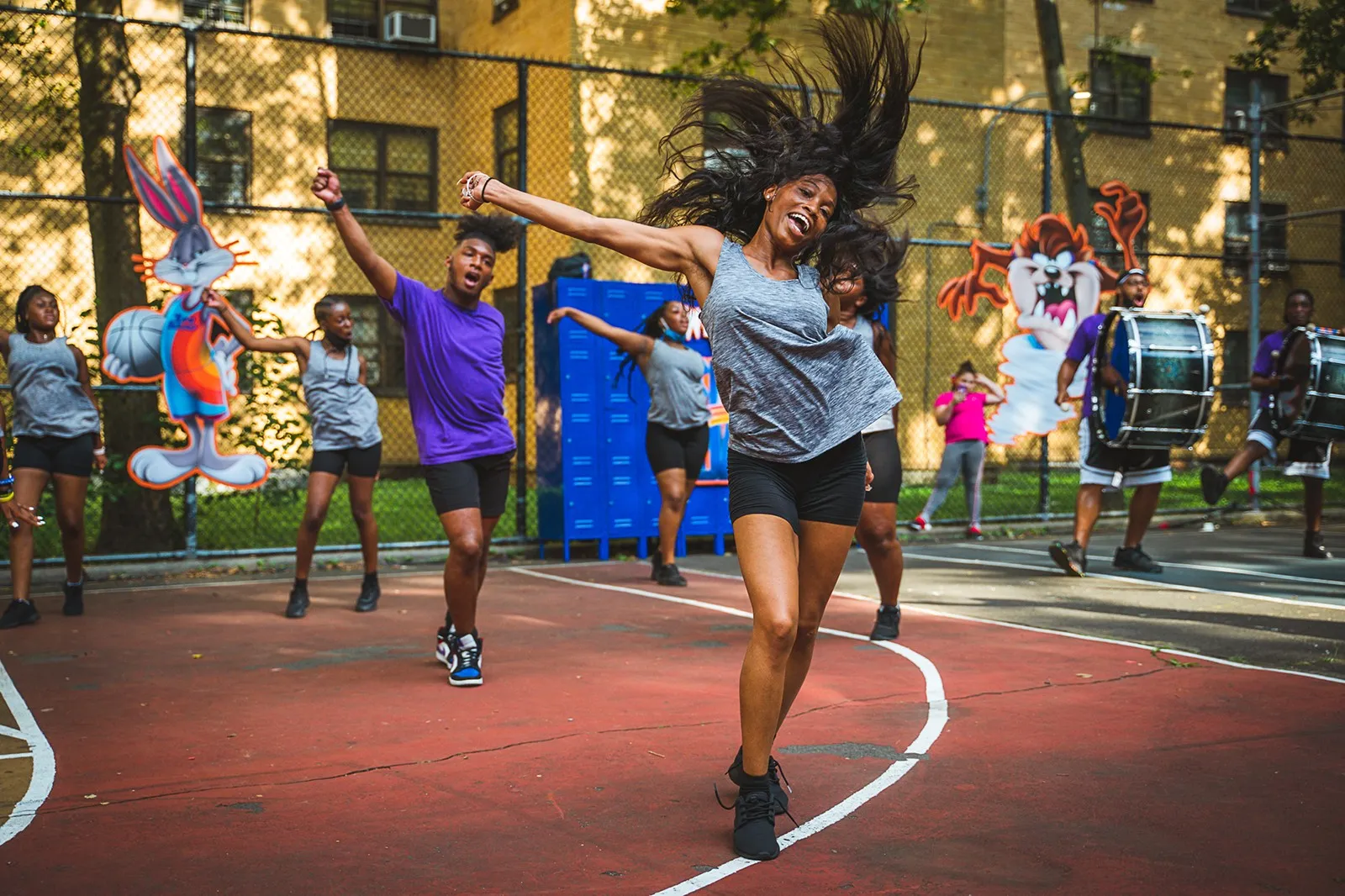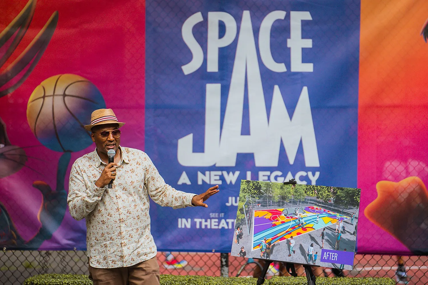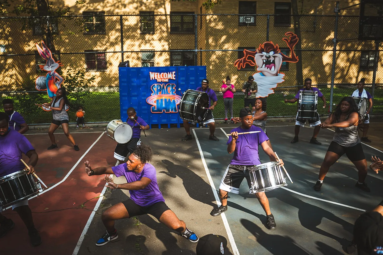To celebrate the efforts and engage both Space Jam and life-long basketball fans, we hosted a Block Party tailored to families and community members of all ages. The festivities opened with a press briefing featuring Manhattan Deputy Borough President Matthew Washington and Space Jam Director Malcolm D. Lee, leading into a weekend of basketball tutorials and dunk tricks led by former Harlem Globetrotters, art and music programming — not to mention tons of special giveaways and lots of surprises.