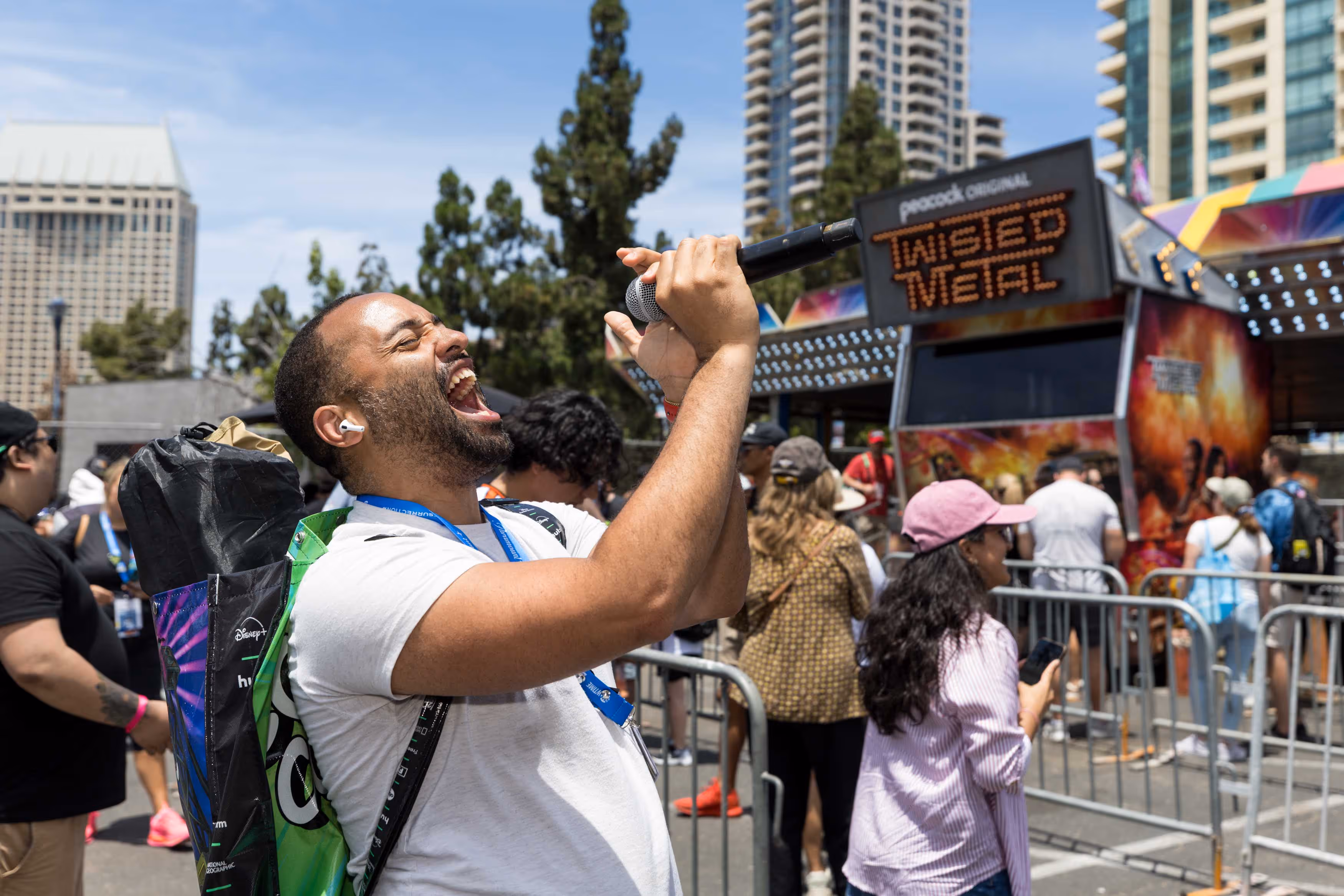 Beyond the bumper arena, every corner of the activation offered a story to capture. From life-size prop cars, cinematic photo opps, free ice cream, and impromptu karaoke, fans were entertained at every turn. Show-stopping appearances from the cast including Anthony Mackie and Stephanie Beatriz transformed our lot into a press hotspot drawing crowds, media crews, and influencer coverage that made Twisted Metal one of the most talked-about experiences at Comic-Con.