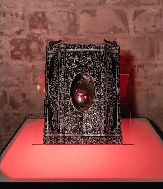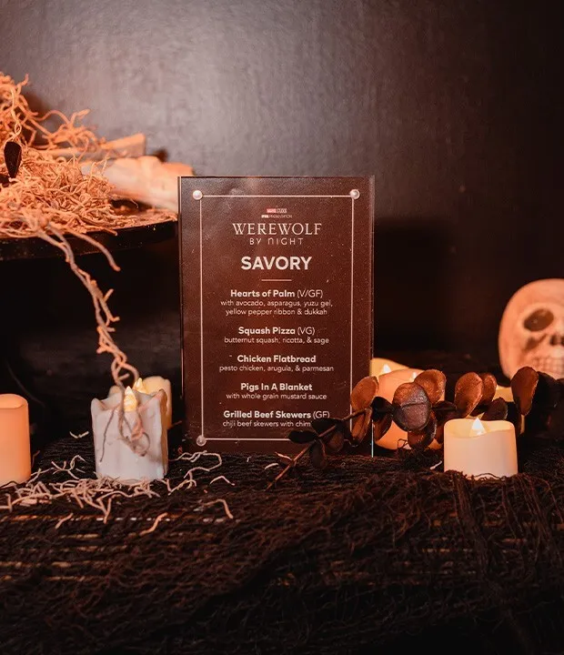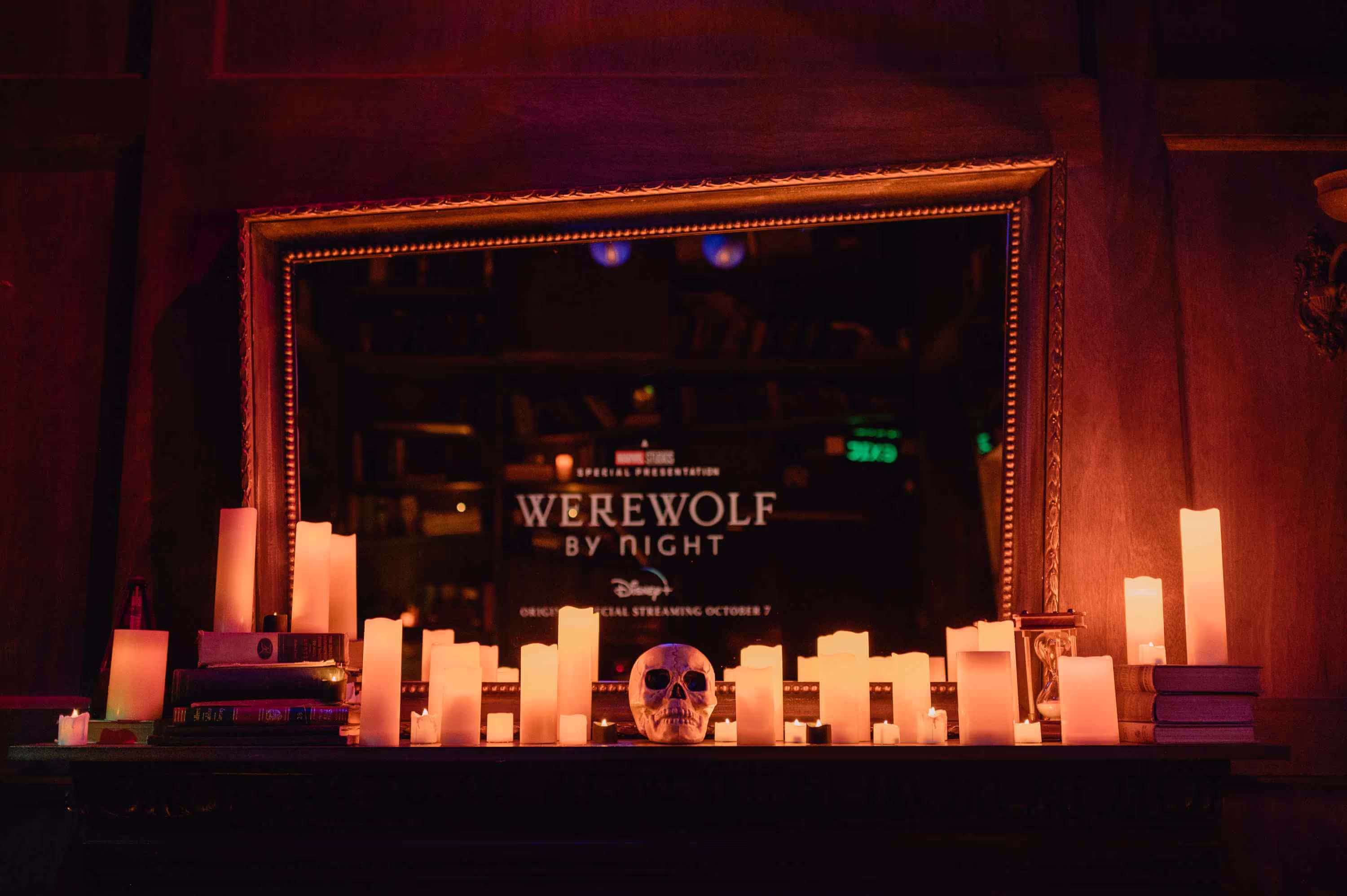 A glowing logo on the exterior building greeted guests as they checked in. Once inside, a moody entrance decked out with flickering candles, skulls and a title treatment hologram set the tone for the rest of the evening.